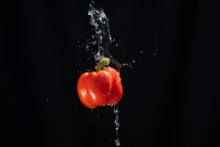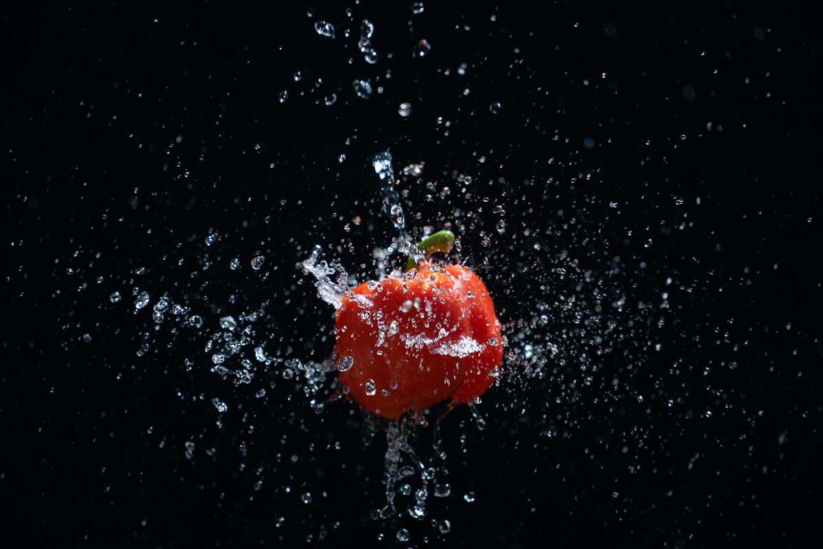 Überraschend gutes Bild ist es geworden. Die Paprika wird von der Sonne angestrahlt, ein Reflektor von schrägunten lässt die Paprika schön hell wirken. Ein einfaches schwarzes Tuch hängt im Hintergrund und das Wasser wird einfach draufgeschüttet beim Auslösen.